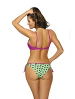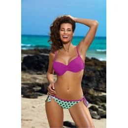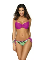 Roztomilé dvoudílné plavky s puntíkovanými kalhotkami. Pro ty, kteří mají rádi aktivní odpočinek nebo lenošení na pláži. Hladká podprsenka s vyztuženými košíčky a kosticemi ve spodní části, navíc se zabudovaným push-upem - díky tomu všemu jsou prsa pozvednutá, přiblížená k sobě, opticky zvětšená a krásně zdobí dekolt. Střed s efektním záhybem. Nastavitelné popruhy, neodnímatelné. Obvod se zapíná sponou. Zadní strana kalhotek je prošívaná, díky čemuž vypadá zadeček zaobleně a velmi žensky. Tkanina s tečkami o průměru 1,5 cm v krásné tropické barvě kombinuje sladkost sušenek s výraznou chutí exotického ovoce. Vazby na bocích.
