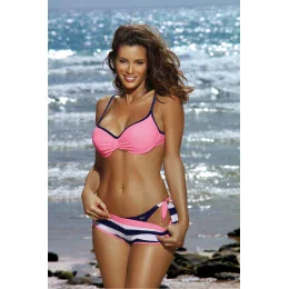 Třídílné plavky v nejkrásnějších letních barvách. Součástí jsou sexy kalhotky a pohodlné šortky. Senzační nabídka pro pláž. Lehce sportovní styl s velkou dávkou ženského sex-appealu. Hladká horní část, určená pro malá a střední prsa. Střih dokonale shromažďuje, pozvedá a opticky zvětšuje prsa, takže jsou na sluncem prohřáté pláži krásnou ozdobou. Košíčky jsou vyztužené jemnou pěnou, mají kostice a zabudovanou push-up výplň. Bez ramínek, nastavitelná ramínka, vzadu zavázaný obvod. Sada obsahuje hladké kalhotky svůdně zavazované na bocích a šortky s pěknými proužky. Můžete je nosit dohromady, jednu na druhé (jak vidíte na obrázku) nebo každou zvlášť. Vytvořte si z nich vlastní skvělé kompozice!