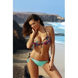 Jedinečné dvoudílné plavky se vzorovanou podprsenkou a spodním dílem na zavazování v rajských barvách. Nenechte si ujít to nejlepší! Žhavé top barvy a zajímavý vzor. Tyto plavky si zaslouží uznání. Navíc se dodávají v jednom z nejlichotivějších střihů - s vyztuženým spodním dílem bikin, který je ještě o krok dál, abyste na pláži vypadala krásně. Jaké je tajemství? Podprsenka má kapsy na přiložené push-up košíčky, díky kterým prsa přiblíží k sobě, pozvedne je a sexy zvětší. Ramínka jsou svůdně zavázaná za krkem, jsou štíhlá a krásná. Elastický obvod, zapínání na zádech na přezku. Uprostřed podprsenky - šperky v etno stylu. Kalhotky na pohodlné podšívce, hladké, se vzorovaným lemováním v horní části, zavazují se na bocích. Kravaty se střapci.