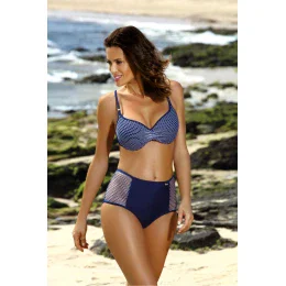 Dvoudílné plavky s vysokým pasem - krásné a velmi pohodlné. Špetka retro stylu v nejžhavějších trendech na pláži.Podprsenka s vyztuženými košíčky, kosticemi a vestavěnou permanentní push-up výplní se zaměřuje na pěknou kolekci a pozvednutí prsou se současným optickým zvětšením. Ažurová síťovina na košíčcích vypadá skvěle. Nastavitelné, neodnímatelné popruhy. Vysoké kalhotky s prolamovanými vsadkami na bocích. Hladká přední část s omezenou elasticitou jemně tvaruje postavu.