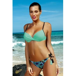 Nejnovější kolekce - velmi ženský dvoudílný kostým, ve kterém budete vypadat sexy. Sada obsahuje skvělé, květinové kalhotky, které se na bocích zavazují na elastické pásky... podprsenka s vyztuženými košíčky, hladká, s kosticemi, silně přibližuje prsa k sobě. Ve spodní části je zabudovaná push-up výplň, která navíc pozvedne, zpevní a opticky zvětší poprsí. Vytváří krásný, smyslný dekolt. Linie podprsenky ve tvaru srdce s ozdobným záhybem uprostřed působí žensky a přirozeně krásně. Ramínka bez ramínek s nastavitelnou délkou, neodnímatelná. Obvod se na zádech pohodlně zapíná sponou. Spodní díl bikin jistě splní všechny vaše plážové požadavky - jedná se o bokové kalhotky s dobrým (ne příliš nízkým a ne příliš vysokým) střihem. Pěkně zdobí boky, mají zajímavé boční vazby (pásky se střapci) a krásný květinový přední díl. Celé v krásných barvách.