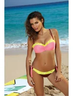 Velmi ženské plavky s krajkovým lemováním a šťavnatými barvami. Na rozpáleném písku bude vypadat senzačně. Krásné barvy plavek vás připraví na (jistě) úspěšné opalování. Podprsenka krásně zdobí tělo, zatímco barevné lemování zvýrazňuje výstřih a okamžitě upoutá pozornost. Tyto plavky doporučujeme především pro malá a střední prsa, protože na nich vypadají nejlépe. Podprsenka s vyztuženými košíčky obohacenými velrybími kosticemi a připojenou velkou push-up výplní, dostupná ve velikostech (S, M, L, XL), pozvedne, zpevní a opticky zvětší prsa a vytvoří "sexy dekolt". Výplň push up lze z modelu zcela vyjmout. Nastavitelné popruhy, které lze pohodlně odepnout. Nastavitelná ramínka, pohodlně odepínatelná. Obvod zavázaný na zádech pro dokonalé přizpůsobení. Bokové kalhotky, svůdně zavázané na bocích, na pohodlné podšívce, s krajkovým lemem. Skvělý návrh na léto!