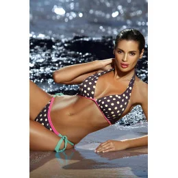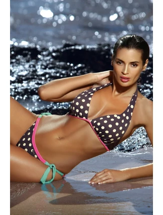 Krásné, velmi ženské dvoudílné plavky v hráškových barvách jako z ovocného sorbetu. Podprsenka s výstřihem a'la Marilyn Monroe, vyztužená a s bočními velrybími kosticemi, dokonale shromažďuje prsa, tvaruje je a krásně prezentuje dekolt. Design je okouzlující, ženský, jemný, ale přesto má charakter. Ramínka se zavazují za krkem, obvod se zapíná na zádech sponou. Kalhotky se k podprsence dokonale hodí, na bocích se zavazují mašličkami ve šťavnaté barvě. Skvěle zdobí boky a poskytují značné pohodlí, protože mají příjemný bokový střih. Ideální plavky pro ženy, které chtějí na pláži vypadat skvěle.