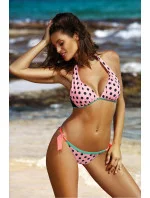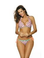 Krásné, velmi ženské dvoudílné plavky v hráškových barvách jako z ovocného sorbetu. Podprsenka s výstřihem a'la Marilyn Monroe, vyztužená a s bočními velrybími kosticemi, dokonale shromažďuje prsa, tvaruje je a krásně prezentuje dekolt. Design je okouzlující, ženský, jemný, ale přesto má charakter. Ramínka se zavazují za krkem, obvod se zapíná na zádech sponou. Kalhotky se k podprsence dokonale hodí, na bocích se zavazují mašličkami ve šťavnaté barvě. Skvěle zdobí boky a poskytují značné pohodlí, protože mají příjemný bokový střih. Ideální plavky pro ženy, které chtějí na pláži vypadat skvěle.