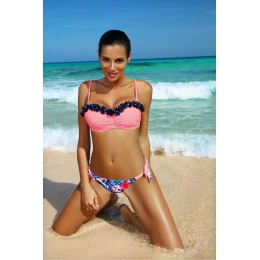 Dvoudílné plavky s květinovým lemováním podél výstřihu. Vypadá romanticky, luxusně a velmi sexy. Návrh pro dámy, které sní o velkých, pevných a sexy prsou, krásně nabraných ve výstřihu. Podprsenka se vyznačuje skvělou konstrukcí, která je určena pro menší a střední prsa - je vyztužená a má poměrně velkou push-up výplň, která je v podprsence trvale umístěna. Umožňuje efektní vypnutí prsou, jejich modelaci a optické zvětšení, které je vidět na obrázku. Použití květinového, jemného lemování v horní části navíc upozorňuje na krásně modelovaný výstřih. Nastavitelná, odnímatelná ramínka, ideální na opalování. Vazby obvodů na zadní straně. Kalhotky jsou vzorované, na bocích zavázané brazylians. Pro dosažení plného efektu je pevně vytáhněte nahoru, aby jejich trojúhelníkový tvar pěkně zdobil spodní část, která částečně přesahuje obrys kalhotek.