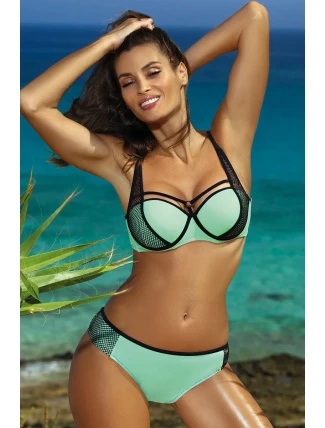 Stylové dvoudílné plavky s módními ramínky ve výstřihu a push-up efektem. Sexy a elegantní. Rozhodně jedny z nejlepších plavek sezóny. Plavky nádherně zdobí tělo a vypadají obzvlášť zajímavě a poutavě. Ramínka, "síťované" boky, kontrastní lemování a krásné barvy jsou největšími přednostmi tohoto modelu. Kromě toho má velmi dobrý střih. Podprsenka s kosticí (spodní a boční), založená na střihu bardotka, dokonale shromažďuje, zvedá a tvaruje prsa a zároveň je opticky zvětšuje. Obsahuje trvalou (z podprsenky neodnímatelnou) push-up výplň. Elastický obvod, zapínání na přezku. Bez ramínek, nastavitelná délka. Kalhotky půvabně zdobí boky, jsou velmi pohodlné a dokonale přiléhají k celku. Ažurová výzdoba na bocích. Plavky jsou vyrobeny z vysoce kvalitní italské elastické tkaniny. Nejnovější kolekce na léto 2018.