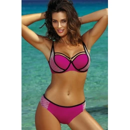 Stylové dvoudílné plavky s módními ramínky ve výstřihu a push-up efektem. Sexy a elegantní. Rozhodně jedny z nejlepších plavek sezóny. Plavky nádherně zdobí tělo a vypadají obzvlášť zajímavě a poutavě. Ramínka, "síťované" boky, kontrastní lemování a krásné barvy jsou největšími přednostmi tohoto modelu. Kromě toho má velmi dobrý střih. Podprsenka s kosticí (spodní a boční), založená na střihu bardotka, dokonale shromažďuje, zvedá a tvaruje prsa a zároveň je opticky zvětšuje. Obsahuje trvalou (z podprsenky neodnímatelnou) push-up výplň. Elastický obvod, zapínání na přezku. Bez ramínek, nastavitelná délka. Kalhotky půvabně zdobí boky, jsou velmi pohodlné a dokonale přiléhají k celku. Ažurová výzdoba na bocích. Plavky jsou vyrobeny z vysoce kvalitní italské elastické tkaniny. Nejnovější kolekce na léto 2018.