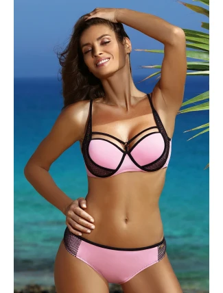 Stylové dvoudílné plavky s módními ramínky ve výstřihu a push-up efektem. Sexy a elegantní. Rozhodně jedny z nejlepších plavek sezóny. Plavky nádherně zdobí tělo a vypadají obzvlášť zajímavě a poutavě. Ramínka, "síťované" boky, kontrastní lemování a krásné barvy jsou největšími přednostmi tohoto modelu. Kromě toho má velmi dobrý střih. Podprsenka s kosticí (spodní a boční), založená na střihu bardotka, dokonale shromažďuje, zvedá a tvaruje prsa a zároveň je opticky zvětšuje. Obsahuje trvalou (z podprsenky neodnímatelnou) push-up výplň. Elastický obvod, zapínání na přezku. Bez ramínek, nastavitelná délka. Kalhotky půvabně zdobí boky, jsou velmi pohodlné a dokonale přiléhají k celku. Ažurová výzdoba na bocích. Plavky jsou vyrobeny z vysoce kvalitní italské elastické tkaniny. Nejnovější kolekce na léto 2018.