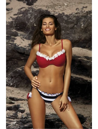 Velmi ženské dvoudílné plavky, ve kterých budete jednoduše vypadat krásně. Podprsenka s krásným květinovým lemováním (každá květina má malý ozdobný bižuterní korálek) je stylová a zcela odlišná od ostatních výrobců. Působí romanticky a okouzlujícím dojmem a zároveň prsa přibližuje k sobě, výrazně je tvaruje a opticky zvětšuje. Vyztužená konstrukce s kosticemi a push-up výplní, tentokrát trvale zabudovanou do podprsenky - takže si můžete užívat svůdný vzhled a plné pohodlí. Popruhy jsou nastavitelné, nikoliv odnímatelné. Obvod svázaný vzadu. Úhledné, horizontálně pruhované kalhotky. Skvěle vypadají v kombinaci s bílou barvou, která zvýrazní vaše opálení. Pohodlný střih (ani příliš nízký, ani příliš vysoký). Na bocích jsou stylové vázačky zakončené třásněmi. Střih dna opticky prodlužuje nohy. Jedny z nejzajímavějších plavek sezóny.