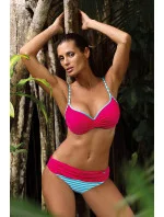 Krásné dvoudílné plavky, jejichž barva dokonale ladí se vzorem. Vyrobeno z vysoce kvalitní italské tkaniny. Má hladkou push-up podprsenku, která smyslně tvaruje a zvětšuje prsa a vytváří svůdný plážový dekolt. Push-up se dodává v každé velikosti plavek a není z modelu snímatelný. Košíčky s kosticemi jsou zevnitř vyplněny speciální push-up pěnou (je k dispozici v každé velikosti plavek a není možné ji z podprsenky vyjmout). Umožňuje získat plné, ženské poprsí s maximálně přirozeným vzhledem. Ozdobná ramínka (pruhovaná) se vztahují ke kalhotkám. Obvod svázaný vzadu. Kalhotky půvabně zdobí boky a jejich zadní část lehce odkazuje na v současnosti módní brazilský střih. Edice "Sweet & Sexy", rozhodně doporučujeme!