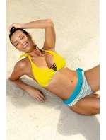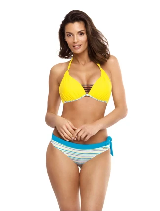 Stylové plavky, ve kterých se budete na pláži krásně vyjímat. Podprsenka s trojúhelníkovými košíčky vyztuženými speciální pěnou, obohacená o push-up, díky níž se prsa pozvednou a opticky zvětší, čímž vznikne smyslný, hluboký dekolt. Push-up je trvale umístěn v plavkách a není z modelu vyjímatelný, dodává se v každé velikosti plavek. Podprsenka upoutá pozornost také módním doplňkem v podobě "gumových pásků" umístěných ve výstřihu. Pěkná ramínka uvázaná u krku, zdobená jemnou bižuterní ozdobou (lze ji odejmout), budou na slunci vypadat atraktivně. Kalhotky mají dokonalý "midi" střih se středovou výškou. Jsou vzorované a ozdobně zavazují na boku (klasický, nazouvací střih).