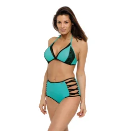 Jedny z nejlepších plavek z kolekce Léto 2019! Krásné barvy, módní střih, vysoký spodní díl a push-up podprsenka. Objednejte si ji a naplánujte si dokonalou dovolenou! Podprsenka se pohodlně zavazuje za krkem a na zádech, má vyztužené košíčky, které jsou obohacené o push-up, díky čemuž jsou prsa dokonale shrnutá, pozvednutá a zvětšená (push-up výplň je přítomna v každé velikosti plavek a není z modelu vyjímatelná). Dekolt je vyroben z hladkého černého tylu. Na košíčcích je vsadka z látky imitující smyslnou krajku. Kalhotky jsou opravdovým hitem - jsou vyšší, a proto velmi pohodlné, zakrývají také bříško a díky páskům-gumičkám na bocích vypadají stále žensky a svůdně. Italská tkanina, krásné barvy na výběr. Nechte se zlákat, protože to stojí za to.