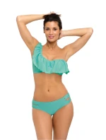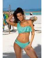 Zajímavé plavky v jednom z nejmódnějších stylů současnosti - latinskoamerických. Dvoudílné a hladké. Součástí sady je podprsenka zavazovaná na zádech, která imituje top na jedno ramínko. Výstřih s velkým, vzdušným volánem z lehké italské látky vypadá fenomenálně. Krásné prázdninové barvy. Podprsenka je bez kostic, s tvarovanými, skrytými vložkami pro tvarování prsou a vyztužením na vnitřní straně, díky nimž prsa vypadají přitažlivě. Vložky lze z modelu vyjmout, čímž vznikne "měkká" verze podprsenky. Kalhotky mají velmi dobrou výšku, jsou velmi pohodlné a po stranách je zdobí svůdné praskliny.