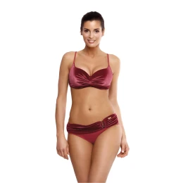 Něco úplně jiného! Tyto sexy a velmi elegantní plavky jsou vyrobeny z italské tkaniny připomínající měkký velur. Má nádherný perleťový lesk a nádherný vzhled, okamžitě dodává šarm, láká oči a nádherně zdobí tělo. Push-up podprsenka s tvarovanými, vyztuženými košíčky s kosticemi v klasické, osvědčené, velmi dobré konstrukci - umožňuje shromáždit, pozvednout a opticky zvětšit prsa. Push-up je součástí každé velikosti plavek a není z modelu odnímatelný. Ramínka jsou nastavitelná, obvod se pohodlně zavazuje vzadu. Úhledné kalhotky s páskem vpředu. Na výběr je mnoho fascinujících barev. Objednejte si ji a přesvědčte se sami. Doporučujeme ji na 100 %.