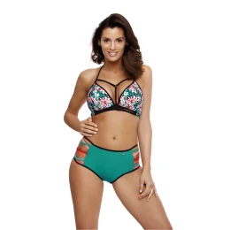 Jedny z nejzajímavějších plavek z kolekce na léto 2019, výrobce Marko. Model Molly M-504, který kombinuje několik módních plážových trendů. Černé pruhované gumičky ve výstřihu, ozdobné lemování pod prsy, pruhy na bocích, květiny a vysoké nohavičky, které vám zaručí naprosté pohodlí, a to není vše... Podprsenka má vyztužené košíčky s push-up efektem, které umožňují pěkně shromáždit a vytvarovat prsa a krásně je prezentovat ve výstřihu. Push-up je v modelu trvale umístěn, není z plavek vyjímatelný a dodává se ve všech velikostech. Podprsenka se zavazuje jako bikiny, vzadu i za krkem. Květinový vršek se krásně hodí k hladkému spodnímu dílu. Krásné barvy a italská tkanina nejvyšší kvality. To je ono!