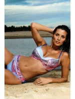 Zajímavé dvoudílné plavky ušité z italské vzorované látky. S potiskem na šířku. Liší se od klasických hladkých modelů a působí elegantně a žensky. Navíc má velmi dobře zpracovanou konstrukci - podprsenka je vyztužená speciální pěnou, pěkně sbírá a tvaruje prsa, má podšívku zpevňující konstrukci a push-up, která umožňuje opticky zvětšit poprsí a zlepšit symetrii těla (push-up bez možnosti vyjmutí modelu, k dispozici v každé velikosti plavek). V pase se zavazuje na zádech. Kalhotky jsou o něco vyšší než obvykle a velmi pohodlné. Vzorovanou přední stranu doplňuje hladká zadní strana. Vysoce kvalitní italská tkanina.