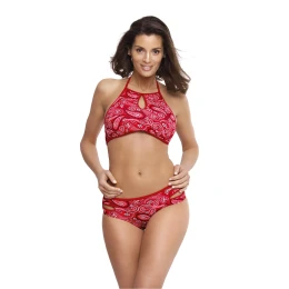 Módní a zajímavé dvoudílné plavky se zabudovaným horním dílem. Je vyroben ze vzorované matné tkaniny. Spodní část podprsenky má tvarované trojúhelníkové košíčky, vyztužené pěnou a doplněné push-up, takže poprsí je správně nabrané a modelované. Push-up se dodává v každé velikosti plavek a není z modelu snímatelný. Podprsenka se pohodlně zavazuje na zádech a za krkem. Kalhotky mají svůdné boční záhyby. Vpředu jsou vzorované, vzadu hladké a mají správnou výšku (ani příliš nízkou, ani příliš vysokou), takže se hodí na pláž. Sportovní styl s nádechem etna...