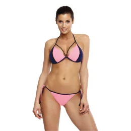 Návrh pro milovníky barev - fenomenální dvoudílné plavky v bikinovém střihu. Vázání za krkem, na zádech a po stranách boků. Sexy a velmi ženské. Hladké košíčky s kontrastním černým lemováním jsou vyztužené, bez push-up, dobře sbírají a zpevňují prsa a zároveň je přibližují k sobě. Výstřih je doplněn dvěma ozdobnými pásky zakončenými drobnými šperky. Svůdné kalhotky s nízkým sedem jsou velmi ženskou volbou na pláž. Italská tkanina.