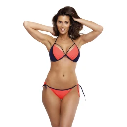 Návrh pro milovníky barevných fenomenálních dvoudílných plavek v bikinovém střihu. Vázání za krkem, na zádech a po stranách boků. Sexy a velmi ženské. Hladké košíčky s kontrastním černým lemováním jsou vyztužené, bez push-up, dobře sbírají a zpevňují prsa a zároveň je přibližují k sobě. Výstřih je doplněn dvěma ozdobnými pásky zakončenými drobnými šperky. Svůdné kalhotky s nízkým sedem jsou velmi ženskou volbou na pláž. Italská tkanina.