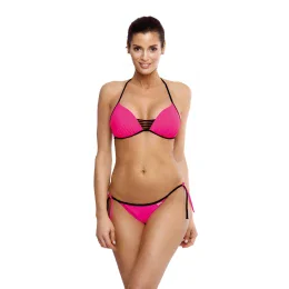 Svůdné dvoudílné plavky ve stylu bikin. Má hladké košíčky vyplněné push-up pěnou, díky níž prsa vypadají blíže k sobě, jsou zvednutá a zvětšená. Push-up se dodává ve všech velikostech a není možné jej z modelu vyjmout. Uprostřed podprsenky jsou módní černá gumová ramínka. Kontrastní lemování dodává postavě charakter a krásně zvýrazní vaše opálení. Skvělé kalhotky se zavazují na obou stranách - díky nim si můžete velikost spodního dílu přizpůsobit svým potřebám. Krásná, vysoce kvalitní italská látka v tuctu nádherných barev, ze kterých si můžete vybrat. Na pláži bude vypadat prostě fenomenálně (a vy - žensky a sexy). Ramínka a obvod podprsenky se pohodlně zavazují.