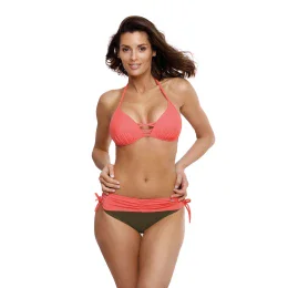 Dvoudílné plavky z kolekce Léto 2019 ušité z italské látky. Podprsenka s košíčky vyztuženými jemnou pěnou, s push-upkou trvale umístěnou v modelu (nelze ji vyjmout), krásně shromažďuje prsa, přibližuje je k sobě a opticky je zvětšuje, čímž najednou vytváří hluboký, smyslný dekolt. Popruhy uprostřed tento sexy dojem ještě umocňují. Push-up se dodává v každé velikosti modelu. Podprsenka se zavazuje za krkem i na zádech. Součástí sady jsou kalhotky s ozdobnými vázačkami na bocích, které jsou tradičně vsazené (vázačky jsou ozdobným prvkem). Elegantní barvy, které dokonale odpovídají letnímu klimatu.