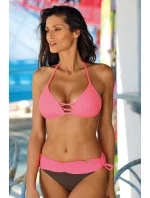 Dvoudílné plavky z kolekce Léto 2019 ušité z italské látky. Podprsenka s košíčky vyztuženými jemnou pěnou, s push-upkou trvale umístěnou v modelu (nelze ji vyjmout), krásně shromažďuje prsa, přibližuje je k sobě a opticky je zvětšuje, čímž najednou vytváří hluboký, smyslný dekolt. Popruhy uprostřed tento sexy dojem ještě umocňují. Push-up se dodává v každé velikosti modelu. Podprsenka se zavazuje za krkem i na zádech. Součástí sady jsou kalhotky s ozdobnými vázačkami na bocích, které jsou tradičně vsazené (vázačky jsou ozdobným prvkem). Elegantní barvy, které dokonale odpovídají letnímu klimatu.