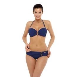 Cameron M-523 jsou dvoudílné plavky v krásné barvě, zdobené stylovými šperky. Podprsenka v bandeau konstrukci má vyztužené košíčky (bez push-upky) obohacené o kostice, díky nimž pěkně tvaruje dekolt a udržuje prsa ve správné poloze. Střih pěkně shromažďuje prsa, což je ideální na pláž. Pásek vede přes krk a je odnímatelný. Plavky mají vzadu zavazování na gumičku. Kalhotky jsou velmi pohodlné, přední část je zdobena páskem s drahokamy. Je vyroben z vysoce kvalitní italské tkaniny, díky níž vypadá velmi elegantně. Zvolte si ji a dovolená se vám jistě vydaří!