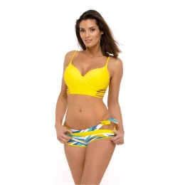 Úplná novinka! Třídílné plavky s podprsenkou, která připomíná smyslný polokorzet. A dva páry vzorovaných kalhotek. Jaké jsou tyto plavky? Je to ženskost a pohodlí v sexy prostředí. Podprsenka má vyztužené, profilované košíčky, obohacené o kostice i push-up, díky nimž nádherně pozvedne prsa, přiblíží je k sobě a silně je zvětší, čímž vytvoří hluboký, svůdný dekolt. Push-up se dodává ve všech velikostech a není možné jej z plavek vyjmout. Na bocích podprsenky jsou elastická ramínka, která jí dodávají charakter. Elastický pásek se vzadu zapíná na přezku. K tomu svůdný spodní díl bikin se zavazováním na bocích a šortky v lehce sportovním stylu. Jedná se o fenomenální sadu, kterou stojí za to objednat. Krásné barvy. Vynikající kvalita (plavky jsou vyrobeny z italské tkaniny).