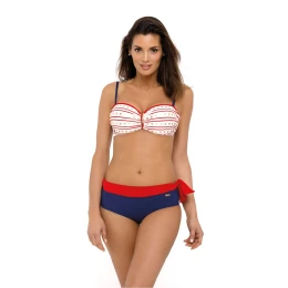 Pohodlné dvoudílné plavky se vzorovanou podprsenkou a mírně vyššími, pohodlnými kalhotkami. Vyrobeno z italské tkaniny v krásných barvách. Podprsenka horizontálního střihu působí jako bardotka, zvedá a vypíná prsa a zároveň je opticky zvětšuje. Konstrukce je vyztužená pěnou, s kosticemi a zabudovaným push-upem (push-up je v každé velikosti). Podprsenka je ideální i na opalování, její ramínka jsou zcela odepínací. Jednoduchý spodní díl bikin s ozdobným zavazováním na bocích vás na pláži rozhodně nebude omezovat.