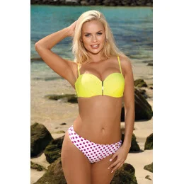 Elegantní plavky se špetkou prázdninové lehkosti. Souprava obsahuje hladkou podprsenku, uprostřed mírně staženou, s krásnou broží ve zlaté barvě a samozřejmě velkou push-upkou, kombinovanou se sexy brazilskými kalhotkami.