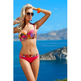 Stylové plavky se spodním dílem, který vlastně představuje dva střihy, midi a maxi (stačí odhrnout lemování viditelné v horní části spodního dílu a získáte vyšší, klasičtější střih z klasického zadního dílu). Plavky se vyznačují také krásnou, teplou, malinovou barvou a zajímavým vzorem. Košíčky podprsenky jsou vyztužené, s kosticemi, s push-up, kterou lze z modelu vyjmout, a s odnímatelnými ramínky. Dokonale zvedne a zvětší prsa o více než jednu velikost.