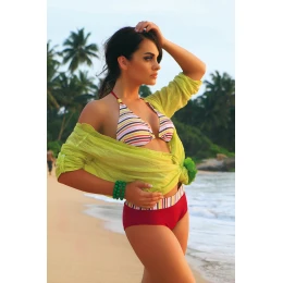 Dvoudílné plavky se šortkami. Barevný pruhovaný model plavek, trochu sportovní, ideální na plavání nebo opalování. Velmi pohodlné, polstrované košíčky s vyjímatelnými vycpávkami. Popruhy s drobnými bižuterními akcenty. Hladké šortky s ozdobným lemováním.