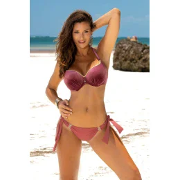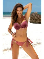 Dvoudílné plavky z italské tkaniny Carvico Tessuti. Podprsenka se zavazuje na zádech a za krkem. Podprsenka shromažďuje prsa od boků ke středu výstřihu. Vyztužené košíčky s neodnímatelnými push-up vložkami. Kalhotky hladké, podšité, zavázané na bocích. Ve velikosti 44 bez push-up vložek.