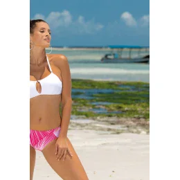 Dvoudílné plavky, ideální pro malé a střední poprsí. Podprsenka bez push-up, zavazuje se na zádech. Polstrované košíčky. Popruhy se zapínají atypicky, jsou nastavitelné. Kalhotky s pohodlným střihem, podšité. Vyrobeno z italské tkaniny Carvico Tessuti. Polský výrobek.
