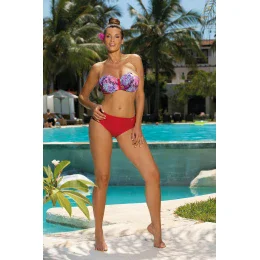 Dvoudílné plavky z italské tkaniny Carvico Tessuti. Podprsenka se zavazuje na zádech, s kosticemi s neodnímatelnými push-up vložkami. Push-up efekt s krásným, přirozeným vzhledem. Hladké kalhotky s podšívkou a prošíváním na bocích. Ideální pro malé a střední poprsí. Nastavitelné popruhy, atypicky zapínané. Tip: objednejte si větší velikost než obvykle.