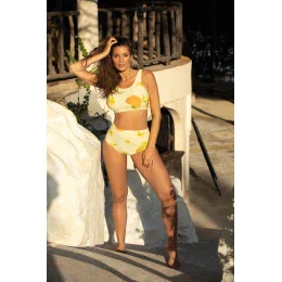 Dvoudílné plavky ve sportovním stylu. Perfektně sedí. Podprsenka v podobě elastického topu bez velrybích kostic, vyjímatelné vložky. Kalhotky s vysokým pasem. Vyrobeno z italské tkaniny Carvico Tessuti. Krásné barvy zdůrazňují opálení. Polský výrobek.
