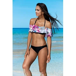 Dvoudílné plavky z pevné elastické tkaniny. Podprsenka v podobě elastického topu s ozdobným volánkem. Podšité kalhotky s pohodlným střihem.