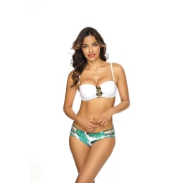 Hladká podprsenka bardotka s kosticemi má vyztužené košíčky a integrovaný push-up. Ramínka jsou odepínací a nastavitelná. Zavazují se na zádech. Díky složitému řasení v přední části vypadají plavky i přes jednoduchost střihu velmi moderně. Další ozdobou je odnímatelná brož. Soupravu doplňuje velmi působivý spodní díl s motivem exotických rostlin. Na bocích mají propletené šňůrky spojené korálky.