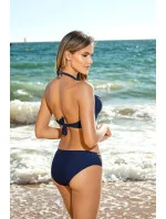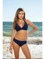 Výjimečné dvoudílné plavky Elena 50/001 v tmavě modré barvě. Měkká podprsenka, s hlubokými pohodlnými košíčky, s podšitím ve spodní části. Ideální pro větší poprsí. Model se zavazuje za krkem a na zádech. Klasické, hladké kalhotky. Živůtek je zdobený zlatým lemováním.