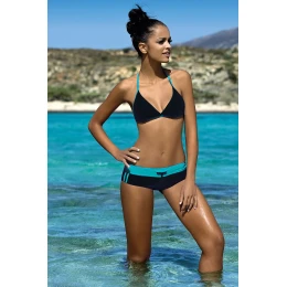 Dvoudílné plavky pro aktivní ženy do bazénu i na pláž. Podprsenka klasického bikinového střihu s vyjímatelnými vložkami, pohodlně zavazující se na zádech a za krkem. Šortky plavky skvěle doplňují. Plavky jsou celopodšité, takže neprosvítají, ani když jsou mokré.
