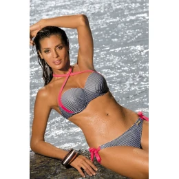 Sladké plavky s pásky, které lze hravě uvázat kolem krku nebo na zádech. V krásných barvách, ideální na léto. Košíčky jsou ve spodní části mírně stažené a vyztužené podšívkou, která skvěle modeluje dekolt. Jsou vyztužené a mají kapsy na přiložené push-up vycpávky (vycpávky jsou k dispozici ve velikostech S, M, L, XL) - vložte je do podprsenky a vaše prsa se opticky zvětší o více než jednu velikost. Plavky působí velmi žensky a koketně. Vzorovaná tkanina (jemné žebrování) podtrhuje její sofistikovaný styl. Obvod podprsenky je elastický a zapíná se na sponu. Plavky nemají tradiční ramínka. Spodní díl je na obou stranách boků sladce zavázaný, velmi pohodlný a velikost si jistě přizpůsobíte svým potřebám. Vpředu vzorované, vzadu hladké.