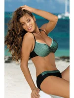 Jeden z nejmódnějších plážových stylů: dvoudílné plavky s prolamovaným zdobením. Pěkně tvarovaný výstřih podprsenky upozorňuje na jemné řasení uprostřed, které jí dodává zajímavý charakter. Profilované košíčky s podvazky obohacené o odolnou (neodnímatelnou) push-up výplň (k dispozici v každé velikosti plavek) senzačně pozvednou prsa a opticky zvětší jejich velikost. Ažurové ozdoby vypadají stylově. Díky stříbrno-zlatým nitím, kterými jsou protkány, se na slunci krásně a jemně lesknou. Obvod podprsenky je elastický. Popruhy jsou nastavitelné, nejsou odnímatelné. Kalhotky klasického střihu s prolamovaným "páskem".