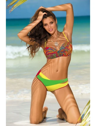 Barevné dvoudílné plavky Margaret M-377, ve kterých se budete na pláži cítit skvěle! Podprsenka má vyztužené košíčky pokryté pěkným tištěným vzorem v krásných exotických barvách. V dolní části (i na bocích) jsou košíčky s kosticemi, které tvarují prsa. Velikosti S, M, L, XL mají navíc kapsy na přiložené (odnímatelné) push-up vložky. Vložte je do košíčků a vaše poprsí se zvedne, prsa se k sobě přiblíží a sexy se zvětší, čímž vznikne dekolt snů. Obvod podprsenky je elastický, vzadu se zapíná na přezku. Ramínka mají nastavitelnou délku, lze je zcela odepnout a pohodlně se opalovat. Kalhotky jsou velmi pohodlné, elastické, vzadu hladké. Barvy dokonale ladí.