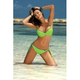 Hladké dvoudílné plavky doplněné vzorovaným lemováním. A skvělé barvy. Velmi ženské. Košíčky podprsenky jsou profesionálně vymodelované a vyztužené - dobře shromažďují prsa do výstřihu, zvedají je a díky podšívce a push výplni je navíc opticky zvětšují. Hluboký výstřih - mírně prohloubený, ale stále velmi elegantní a vyvážený. Nastavitelné popruhy. Obvod tentokrát pohodlně uvázaný na zádech. Kalhotky se zavazují na bocích. Plavky vypadají opravdu skvěle. Na pláži vám poskytne plný komfort. Plavky jsou rychleschnoucí, odolné vůči slunečnímu záření (nevyblednou).
