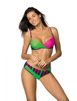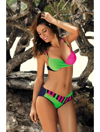 Velmi módní dvoudílné plavky ve skvělých, šťavnatých barvách. Podprsenka s vyztuženými košíčky, s kosticemi a push-up výplní (k dostání od velikosti S do XL včetně) - dokonale shrnuje prsa do výstřihu, pozvedává je a zvětšuje. Push up s možností vyjmutí z podprsenky. Nastavitelné popruhy a zapínání na přezku. Bude vám to slušet! Barvy vypadají skvěle na opáleném těle. Kalhotky s bočními rozparky, se vzorovaným páskem, pohodlné.