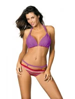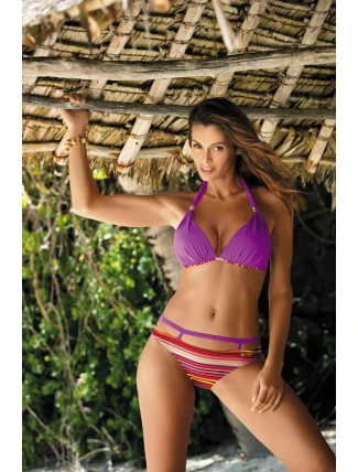 Krásné dvoudílné plavky s dobře tvarovanými košíčky. Takový, který vytváří lákavý výstřih. Košíčky dokonale shromažďují prsa, dobře je tvarují a zároveň je vytahují. Jsou vyztužené zevnitř a obohacené o vestavěnou push up výplň (k dispozici ve všech velikostech) s bočním podšitím. Pěkné lemování okamžitě upoutá pozornost. Popruhy s broží, elegantní, uvázané na krku. Obvod je pohodlně svázán na zadní straně. V dolní části je jemně nařasená tkanina, která podtrhuje jedinečný charakter plavek. Kalhotky mají přídavný pásek, který obepíná boky. Měkké, s podšívkou.