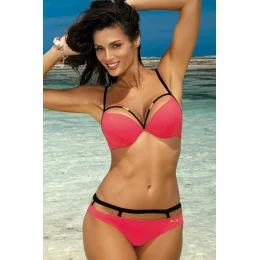 Stylové dvoudílné plavky. Podprsenka s hladkými košíčky dokonale přiléhá k dekoltu, pevně jej zvedá a opticky zvětšuje díky push-up košíčkům, které jsou součástí soupravy (a které lze v případě potřeby z modelu vyjmout). Jeho další výhodou jsou působivá tenká ramínka ve výstřihu, která vypadají velmi sexy. Nastavitelné popruhy. Obvod se zapíná sponou. Součástí jsou pohodlné kalhotky, rovněž zdobené pruhy kolem boků.
