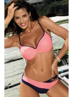 Tyto dvoubarevné plavky působí mimořádně žensky. Vyztužené košíčky s kosticemi a zabudovanou push-up výplní (k dispozici od velikosti S do XL) dokonale shrnují prsa do výstřihu, nadzvedávají je a svůdně zvětšují. Díky mírně vyztuženému středu je podprsenka velmi pohodlná a bude se hodit i při plážových hrách. Nastavitelné popruhy. Obvod se zapínáním na přezku. Plavky vynikají také skvělými kalhotkami. Leží velmi pěkně na siluetě, vypadají půvabně a lákavě (na boční "prasklině").