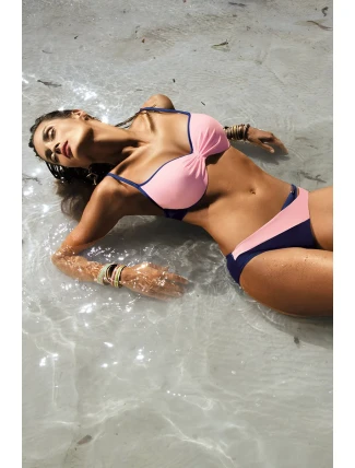Tyto dvoubarevné plavky působí mimořádně žensky. Vyztužené košíčky s kosticemi a zabudovanou push-up výplní (k dispozici od velikosti S do XL) dokonale shrnují prsa do výstřihu, nadzvedávají je a svůdně zvětšují. Díky mírně vyztuženému středu je podprsenka velmi pohodlná a bude se hodit i při plážových hrách. Nastavitelné popruhy. Obvod se zapínáním na přezku. Plavky vynikají také skvělými kalhotkami. Leží velmi pěkně na siluetě, vypadají půvabně a lákavě (na boční "prasklině").