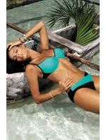 Tyto dvoubarevné plavky působí mimořádně žensky. Vyztužené košíčky s kosticemi a zabudovanou push-up výplní (k dispozici od velikosti S do XL) dokonale shrnují prsa do výstřihu, nadzvedávají je a svůdně zvětšují. Díky mírně vyztuženému středu je podprsenka velmi pohodlná a bude se hodit i při plážových hrách. Nastavitelné popruhy. Obvod se zapínáním na přezku. Plavky vynikají také skvělými kalhotkami. Leží velmi pěkně na siluetě, vypadají půvabně a lákavě (na boční "prasklině").